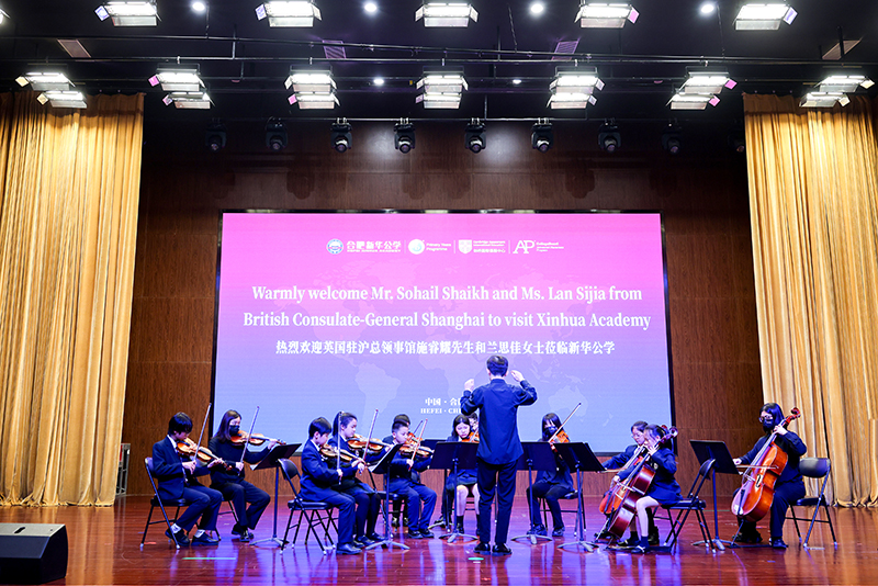 5月25日下午14:00時,英國商業貿易部公使銜參贊施睿耀先生、英國商業貿易部教育與技能司高級貿易投資官蘭思佳女士一行來訪,合肥市教育局辦公室張媛主任陪同,新華公學總校長秦新春、融合部校長溫晨瑋、行政副校長吳晶晶等校領導熱情接待。首先在報告廳舉行了簡單的歡迎儀式,新華國際青少年樂團用精彩的表演對來訪嘉賓表示了熱烈的歡迎。
