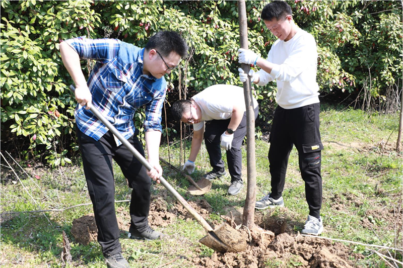 植一株綠色,溢一片春光。格林生態(tài)總部員工一大早就集合在苗圃,他們希望通過(guò)此次植樹(shù)活動(dòng)為苗圃增添“綠色新衣”。在專業(yè)人員的指導(dǎo)下,大家揮鍬鏟土、扶樹(shù)正苗、澆水培土,栽下一棵棵樹(shù)苗。三五人一組,分工合作、默契配合,男生挖坑、鏟土,女生扶苗,填埋,到處都是勤勞忙碌的身影。